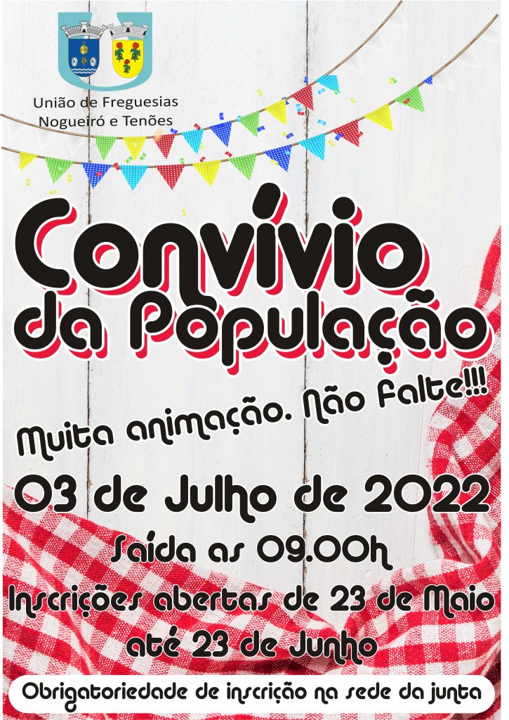 Convívio da População.🎊🎉 Após 2 anos de ausência, 2022 promete ser uma ano de retoma ao qual a UfNogueiró Tenões não faltará. O dia 3 de Julho de 2022 promete ser diferente e com muita animação. Inscreva-se já a partir do dia 23 de Maio na sede da junta. Participe!!!!