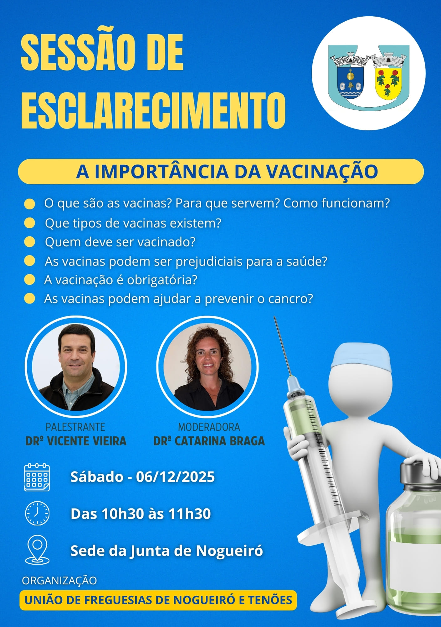 A União de Freguesias de Nogueiró e Tenões convida toda a comunidade a participar na Sessão de Esclarecimento “A Importância da Vacinação”, no próximo dia 6 de dezembro.